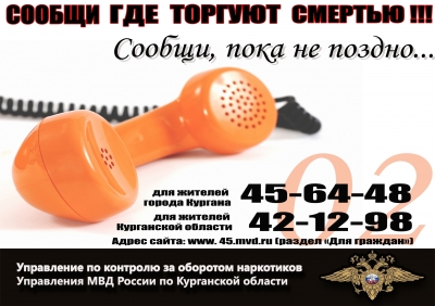 Курганцы, владеющие какой-либо информацией о незаконном обороте наркотиков, могут позвонить в органы внутренних дел по круглосуточному телефону «02». Кроме того, информацию можно сообщить в УМВД России по Курганской области по телефонам «доверия»: 8(3522) 42-12-98, 45-64-48.