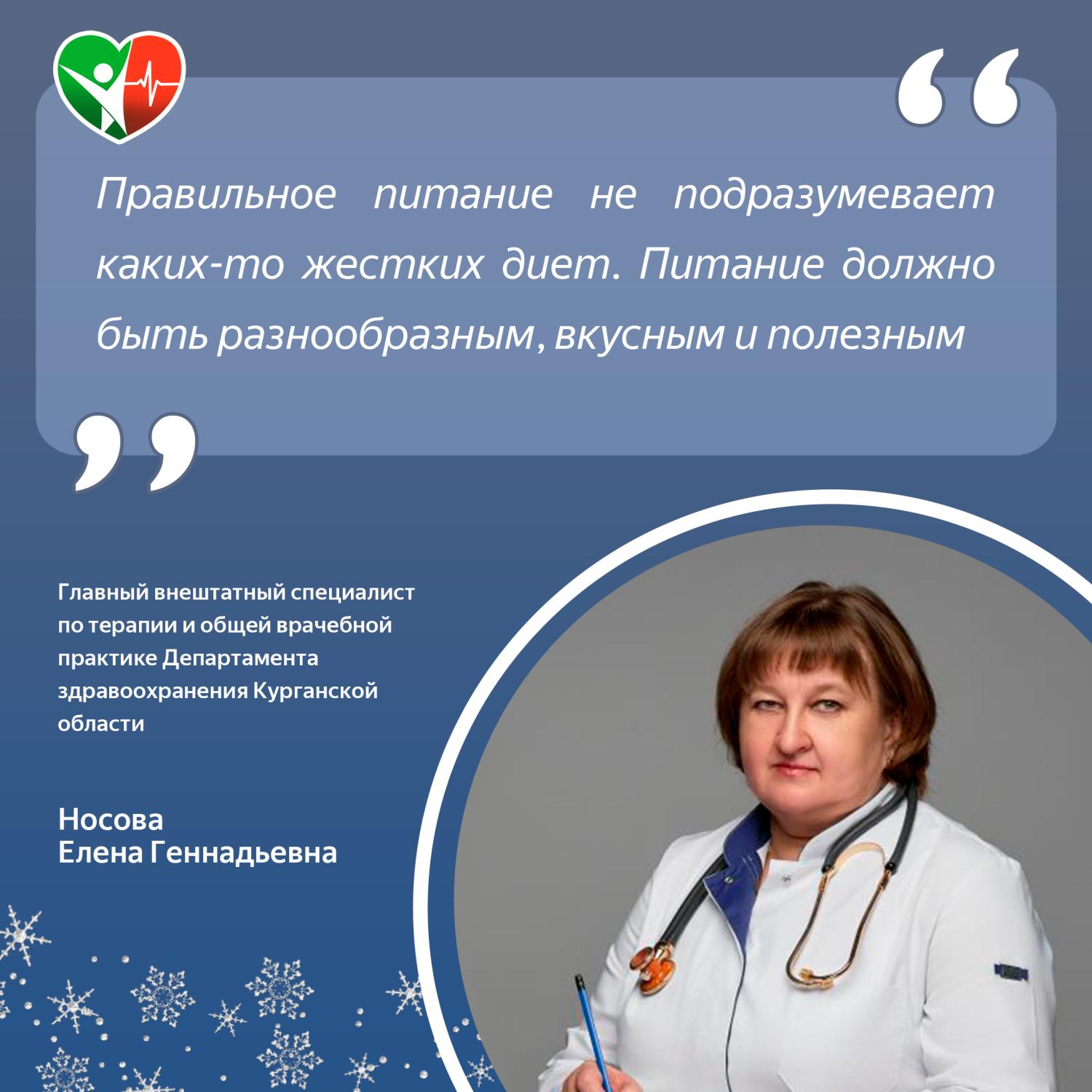 Главный внештатный специалист по терапии и общей врачебной практике Департамента здравоохранения Курганской области, заведующий ревматокардиологическим отделением ГБУ «Курганская областная клиническая больница», врач-ревматолог Носова Елена Геннадьевна рекомендует: «Правильное питание не подразумевает каких-то жестких диет. Питание должно быть разнообразным, вкусным и полезным».